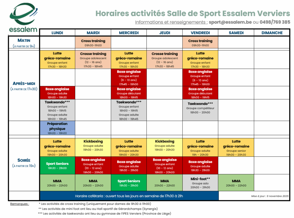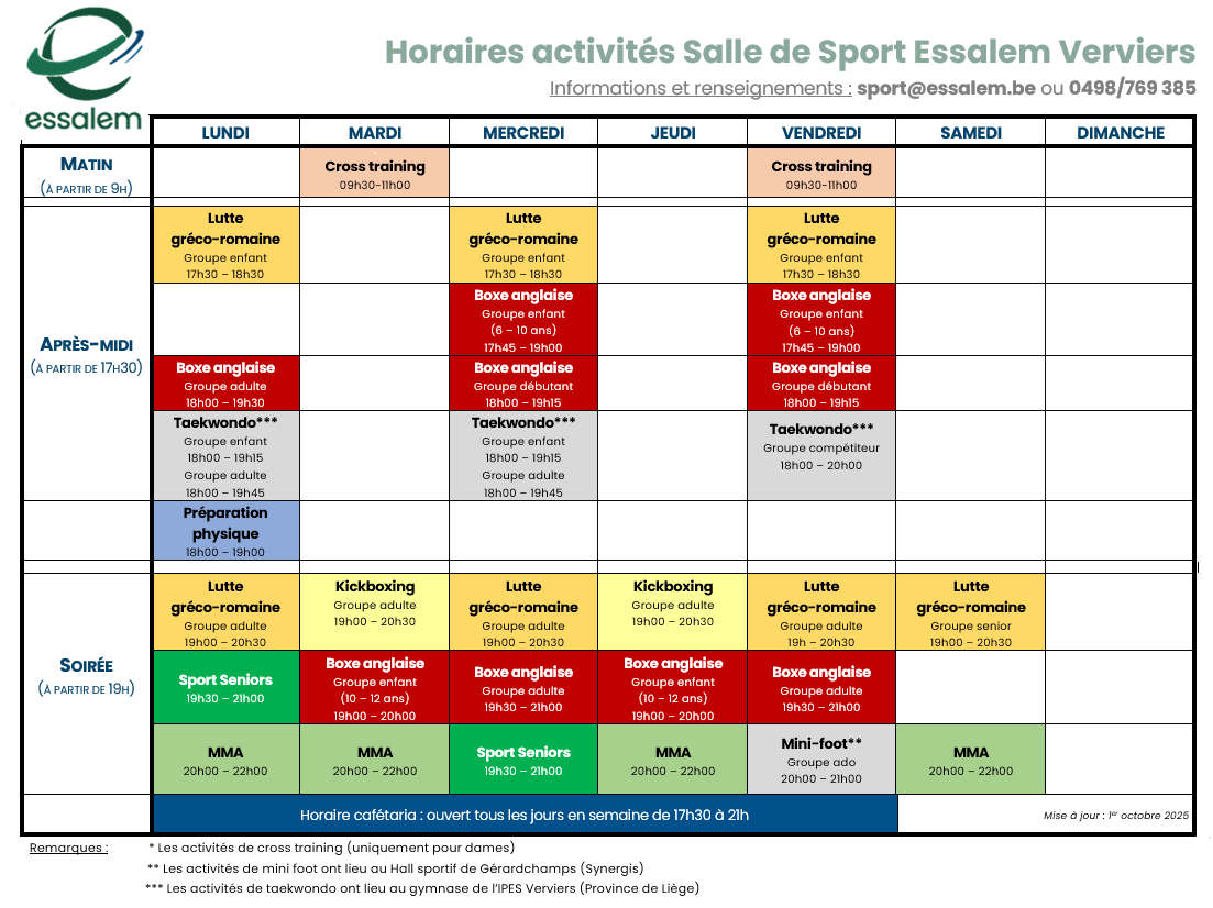 - les activités sportives ont lieu à la salle de sport Essalem, située au 242, rue de Hodimont – 4800 Verviers (accès via le parking partagé), à l’exception des activités de taekwondo (Gymnase de l’IPES Verviers) et de mini-foot (Hall sportif de Gerardchamps),